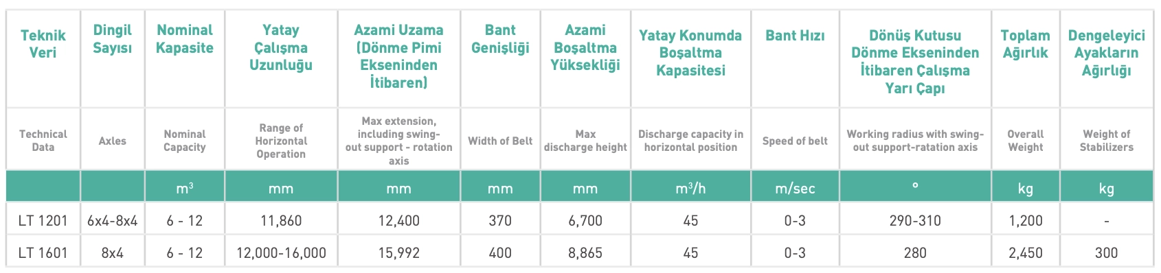 Conveyor belt is driven by a hydraulic transmission unit which is mounted on the secondary auxiliary PTO of the truck. The conveyor belt can rotate 290° degrees on its axis. The compact size of the LT 1200 conveyor makes it ideal for use in work yards and also rough roads where particular problems of space and maneuverability apply. It is ideal also for working in the construction of concrete columns, beams, canal sites, ground works, small floors and road works. The conveyor belt unit is designed also to be able to discharge other truck mixers’ concrete too. There are two different Conveyor belts models; LT1201 and LT1601.