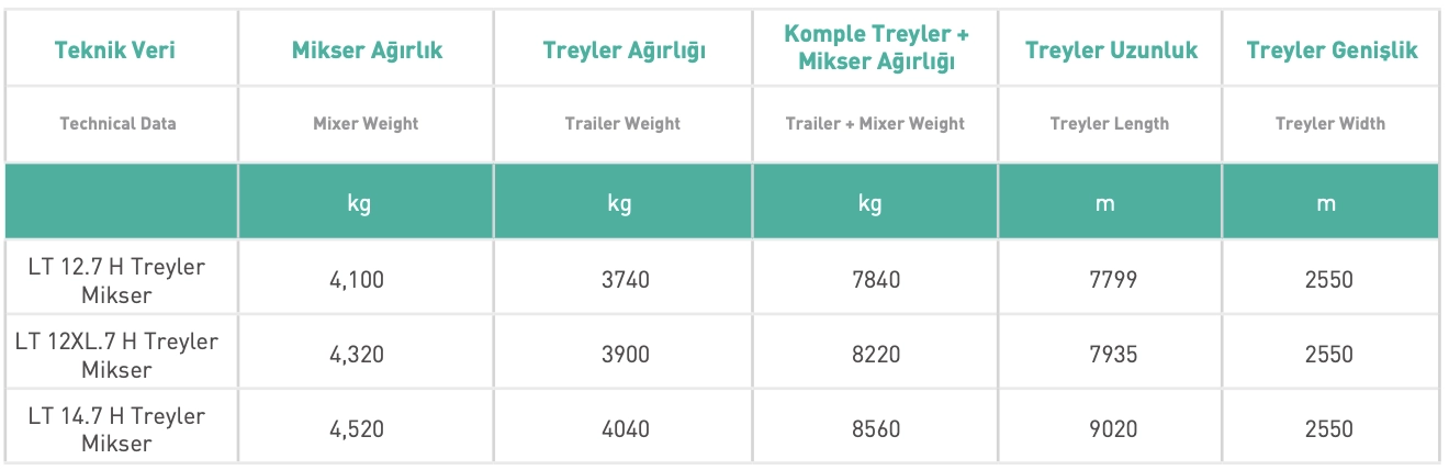 Trailer mixers provide mixing the maximum capacity of the concrete legally and also using the semi-trailer tractor for multiple purposes thanks to its quick-coupling system. There are three main capacities: 12m³, enlarged 12m³, 14m³.